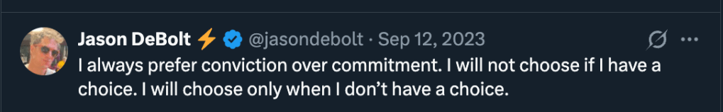 One of my favorite descriptions of conviction comes from Jason Debolt. I particularly like his distinction between commitment and conviction. I think it’s brilliant: