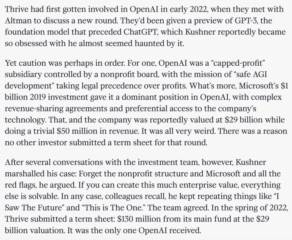 - How did Kushner know OpenAI was the one? He had presumably done the work, and he has excellent judgment to recognize greatness when he sees it.