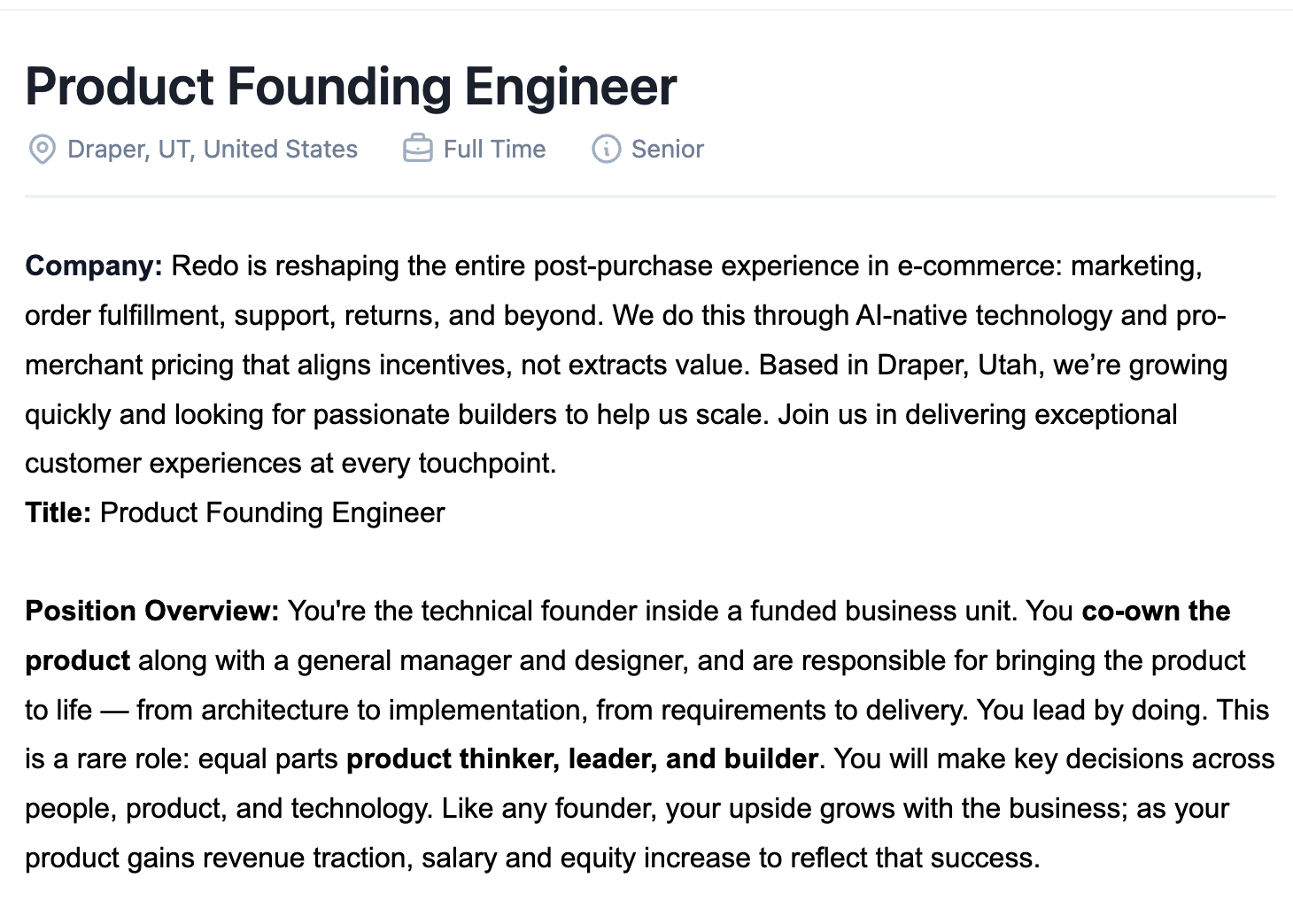 Here’s an example of a role Redo is currently hiring for: a founding engineer for a new product team.